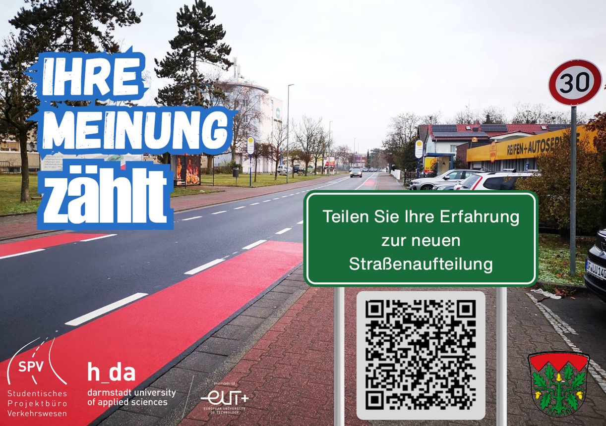 Noch bis Freitag, 19. Dezember, haben Bürgerinnen und Bürger die Möglichkeit an der Meinungsumfrage des Projektteams der Hochschule Darmstadt zum Verkehrsversuch in der Industriestraße bezüglich der neuen Straßenaufteilung - Fahrradschutzstreifen und eine schmalere Kernfahrbahn für den Kfz-Verkehr - teilzunehmen.
