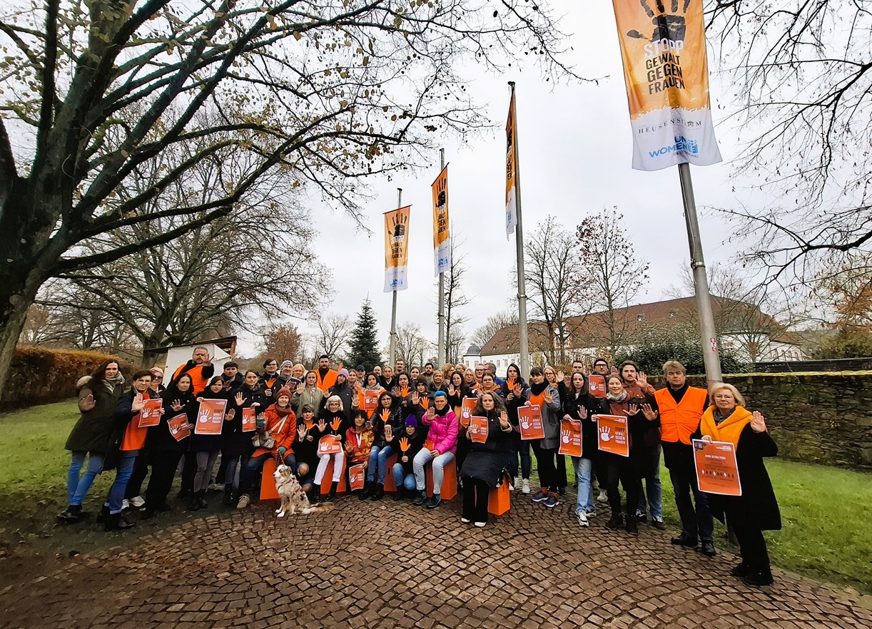 Die Stadt unterstützt die Aktion wieder sehr gerne und hat auf Initiative der verwaltungsinternen Frauen- und Gleichstellungsbeauftragten Gundi Wilz und Derya Arslantürk sowie Johanna Fritz und Katrin Roth vom Frauenbüro als sichtbares Zeichen die orangefarbenen Fahnen mit der klaren Botschaft „Stopp Gewalt gegen Frauen“ am Schloss-Rathaus gehisst.