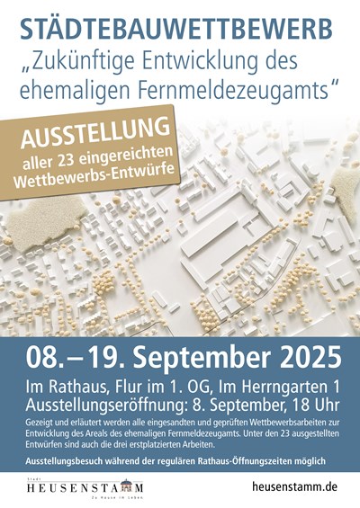 In der Ausstellung, die von Montag, 8., bis einschließlich Freitag, 19. September, im Flurbereich des ersten Obergeschosses im Rathaus, Im Herrngarten 1, stattfindet, werden alle 23 eingesandten und geprüften Wettbewerbsarbeiten zur künftigen Entwicklung des ehemaligen Fernmeldezeugamts gezeigt und entsprechend erläutert.