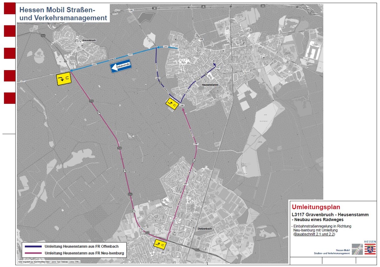 Hessen Mobil, die zuständige Landesbehörde für Bundes-, Landes- und die meisten Kreisstraßen in Hessen, baut einen neuen Rad- und Fußweg entlang der Landesstraße 3117 zwischen dem Neu-Isenburger Stadtteil Gravenbruch und Heusenstamm. Hierfür sind umfangreiche Baumaßnahmen und Umleitungen erforderlich.