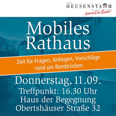 Das Mobile Rathaus mit Bürgermeister Steffen Ball und Erstem Stadtrat Uwe Michael Hajdu sowie Fachbereichs- und Fachdienstleiterinnen und -leitern der Stadtverwaltung startet in die nächste Runde. Am Donnerstag, 11. September, wird das Rathausteam in Rembrücken unterwegs sein. Treffpunkt für die Bürgerinnen und Bürger ist um 16.30 Uhr am Haus der Begegnung, Obertshäuser Straße 32.