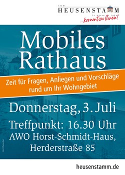 Das Mobile Rathaus mit Bürgermeister Steffen Ball und Erstem Stadtrat Uwe Michael Hajdu sowie Fachbereichs- und Fachdienstleiterinnen und -leitern der Stadtverwaltung startet in die nächste Runde. Am Donnerstag, 3. Juli, wird das Rathausteam rund um die Herderstraße unterwegs sein. Treffpunkt für die Bürgerinnen und Bürger ist um 16.30 Uhr am AWO Horst-Schmidt-Haus, Herderstraße 85.