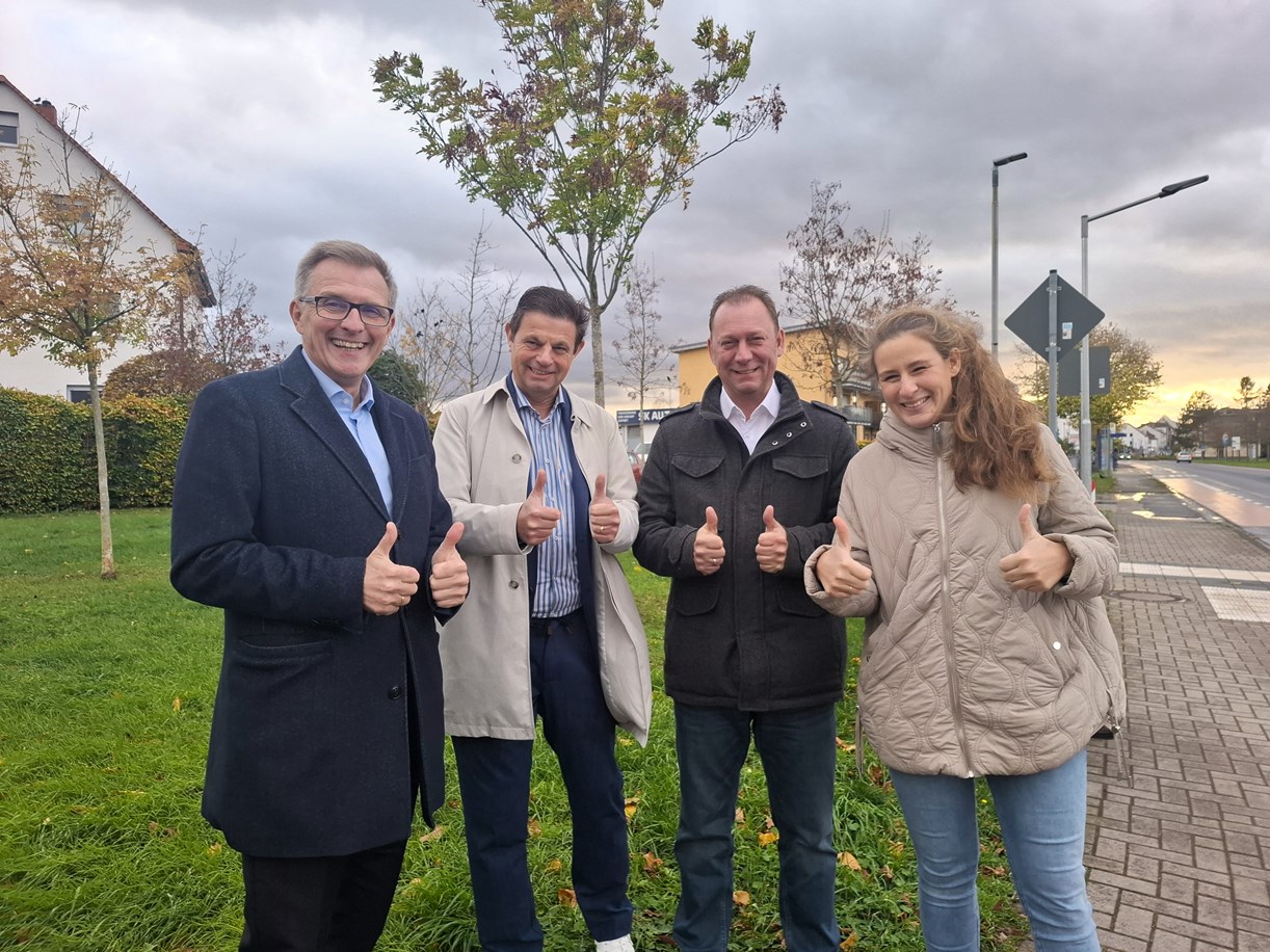 Der Standort für den zentralen Verteilerpunkt (PoP) im Kreuzungsbereich Balthasar-Neumann-Straße/Frankfurter Straße ist beschlossen. V.l.: Bürgermeister Steffen Ball, Projektleiter Hessen Westconnect Matthias Nass, Leiter Regional & Roll-Out-Management West der Westconnect Daniel Böttcher, Wirtschaftsförderin Juliane Blümmel.