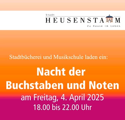 Am Freitag, 4. April, laden die Teams der Stadtbücherei und der Musikschule Heusenstamm zur „Nacht der Buchstaben und Noten“ ins Haus der Literatur in der Schlossstraße 10 ein. Die Aktion findet unter dem Dach der ersten bundesweiten Nacht der Bibliotheken des Deutschen Bibliotheksverbandes e. V. statt.