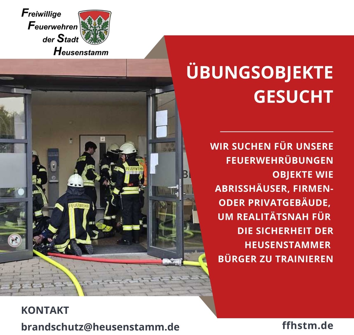 Für eine große Zahl der Ausbildungen des Übungsjahres benötigt die Feuerwehr der Stadt Heusenstamm Übungsobjekte, um in Zugstärke die Brandbekämpfung und technische Hilfeleistung zu trainieren. In den letzten Jahren wurde es immer schwieriger, passende Übungsobjekte ausfindig zu machen und über Kontakte den richtigen Ansprechpartner zu finden.