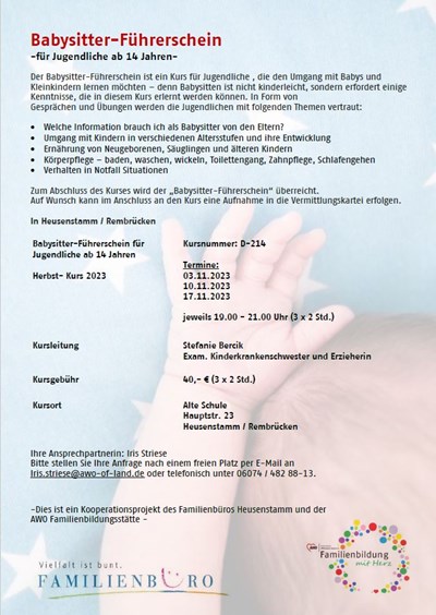 Wer Interesse hat, den Babysitter-Führerschein in Heusenstamm zu machen hat im November 2023 die Chance. Die AWO Familienbildung bietet in Kooperation mit dem Familien- und Frauenbüro bietet entsprechende Kurse an.