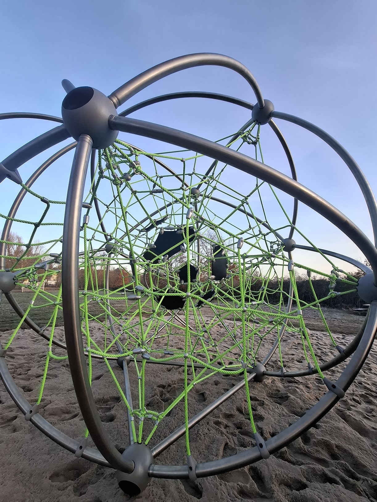 Das bisherige Spielgerät, die sogenannte Kletterspinne, musste zuvor aufgrund von Sicherheitsmängeln demontiert werden. Mit dem Cosmo – für Kinder ab fünf Jahren – steht nun ein rundes Seilspielgerät zur Verfügung, das sich durch zahlreiche frei wählbare Anbauteile und vielfältige Spielaktivitäten auszeichnet. Der Einstieg ist sowohl über ein Raumnetz als auch über ein separates Einstiegsnetz möglich. Für den schnellen Weg nach unten sorgen ein Banister (doppelte Rutschstange) sowie eine zusätzliche Rutschstange. Gummimembranen bieten zudem gemütliche Rückzugs- und Ruheflächen zum Chillen inmitten der Seilkonstruktion.