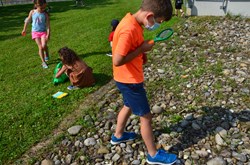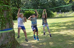 Für die Kinder war es toll, dass sie auf dem Campusgelände weitläufige Wiesenflächen und ganz viel Platz zum Spielen hatten. Es wurde viel in Kleingruppen übers Grün getigert oder mit den Gummihüpfpferdchen geritten, mit dem Pferdegeschirr Pferdchen gespielt, Stöcke gesammelt, Slackline gelaufen, Ballspiele gespielt und so weiter. Daneben gab es viele weitere besondere Angebote - gerne auch unter Verwendung von Naturmaterialien. So bastelten wir Traumfänger und Flöße aus Ästen, stellten selber Farben aus Blättern und Beeren her und bemalten anschließend unsere Baumwollmäppchen damit, kreierten Henna-Tattoos, besprühten T-Shirts, schöpften Papier und und und.